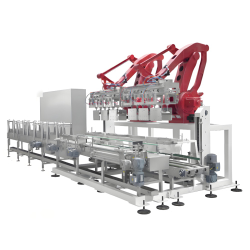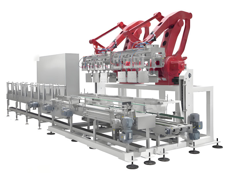 يستخدم روبوتات صناعية عالية الدقة مع دقة تحديد موضع متكررة تبلغ ±0.1 مم، مما يضمن التشغيل السلس والموثوق. يمكن أن تصل سرعة التغليف في الكرتون إلى ما يصل إلى 70 حالة في الدقيقة، مما يتوافق بشكل فعال مع إيقاعات خط الإنتاج عالي السرعة. يعمل التشغيل المتزامن ثنائي القناة على زيادة الكفاءة بنسبة تزيد عن 60% مقارنة بالأنظمة أحادية القناة.