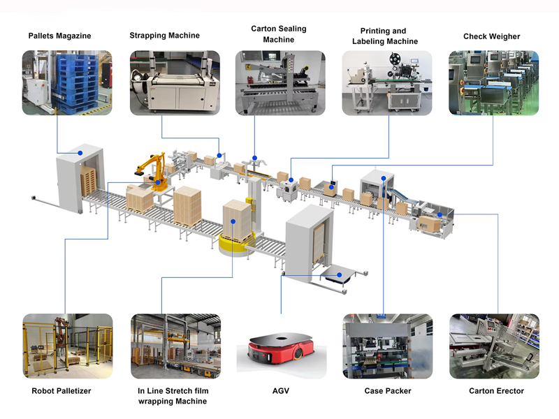 نظام ما بعد التغليف الذكي يعد نظام ما بعد التغليف الذكي حلاً متكاملاً يجمع بين معدات التغليف الآلية والروبوتات وأجهزة الاستشعار وإنترنت الأشياء والتحكم المتقدم في البرامج (مثل MES وWMS). حلول أتمتة التعبئة والتغليف تحقق أتمتة شاملة من نهاية خط الإنتاج إلى عملية إخراج المنتج النهائي.